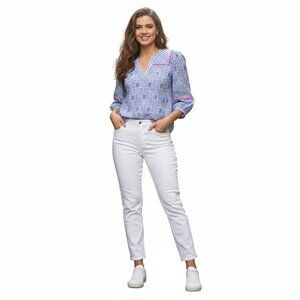Vineyard Vines® tile medallion print top. Size medium. Color is Hydrangea (blue and white with pink trim). Pullover style.100% cotton, machine wash cold.