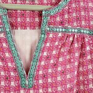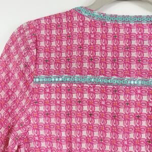 The Vineyard Vines Cowrie Shell Mirrored 100% Silk Tunic Dress in Size 4 features a geometric pattern with embroidered accents and mirrored sequins for added flair.