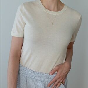 This Vineyard Vines top features a fitted design in a soft cream color, perfect for a sleek and stylish look. The short sleeves and comfortable fabric make it an ideal choice for everyday wear, offering both elegance and ease.