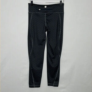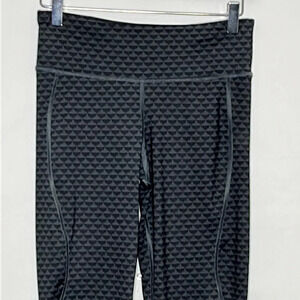 Vineyard Vines Cropped Whale Tail Leggings - Size Small. Excellent pre-owned condition. Wicking and UV protection, whale tail print motif, extra wide waistband, contoured seams, black and gray, back zipper pocket, whale dot above zipper, in seam waistband pocket. Approximate measurements: 13 1/2" waist, 24" inseam, 9" rise.