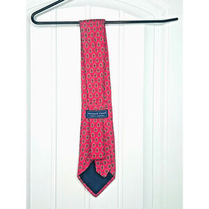 The product is a custom designer silk tie from Vineyard Vines, featuring a pink color with a shield design. Handmade in the United States, this classic-length tie is perfect for men who appreciate high-quality accessories. The tie is designed with a school theme in mind, making it a stylish and unique addition to any man's wardrobe. Made from 100% silk with a woven fabric type, this tie is a versatile and sophisticated choice for any occasion.