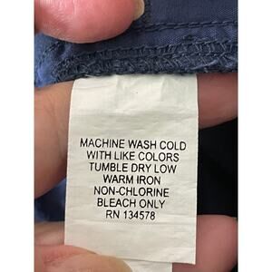 Chino style shorts. Navy blue color. Wide 2" waistband with belt loops. Zips and hooks closed. Two side pockets at front. Embroidered logo at back. Mock back pockets. 14" across waistband at top, 8.5" inch rise, 5" inseam.