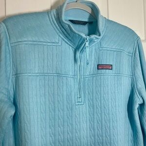 This quarter zip Shep Shirt from Vineyard Vines is so, so soft and has a great cable design. The color is a medium blue shade, leaning a bit towards lighter blue in my opinion. It’s a beautiful shirt! Women’s size Large. Measurements are approx length 26.5 inches, sleeves 25.5 inches, and chest 20.75 inches.