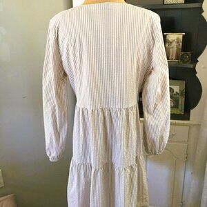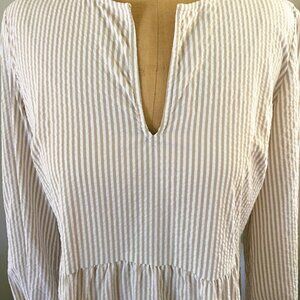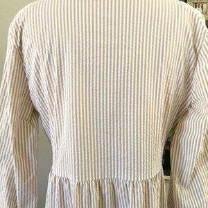 This dress from Vineyard Vines features a tiered design in gray and white seersucker stripes. It has a notched V-neckline and long sleeves with elastic cuffs. Perfect easy-to-throw-on-and-go dress! It measures 19" across the chest and is 34" long. Excellent like new condition.