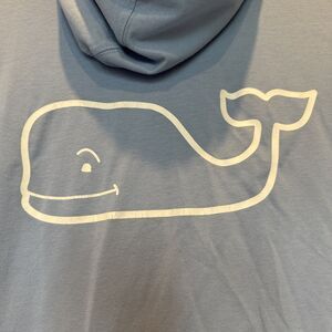 Vineyard Vines Lightweight Hoodie Women's Small Light Blue. Good preowned condition with some cracking to "y" on sleeve logo and to whale on back. Pleasee see all photos for closeups. Curved hem. Cotton blend, amchine care.