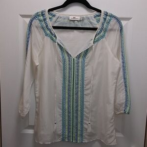· This slightly oversized, tunic top features embroidery down the center front, neckline, and sleeves