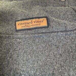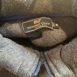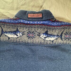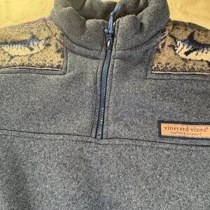 Fair Isle pattern with marlin motif. Stand-up padded collar and 1/4 zip closure with blue cord zipper pull. Vineyard Vines label on the chest and back of collar.