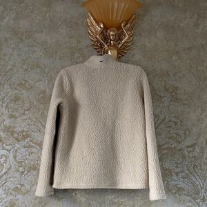 Cozy cream fleece pullover featuring a blue zipper. Perfect for casual wear.
