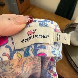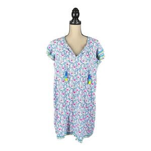 Vineyard Vines Floral Flamingos 100% Linen Tunic Dress in a size large. Pullover with split v-neck with tassels. Flutter layered sleeves. Embroidered stripes at hem and sleeves. 100% linen. Measures approximately 20” armpit to armpit and 35” in length. In great condition.