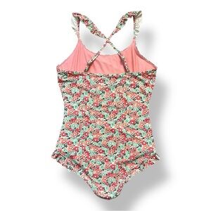 Beautiful one piece swimsuit with all over floral pattern; cross-cross straps; ruffle detail at the shoulders and bottom. Size “L” equates to numerical size 14.