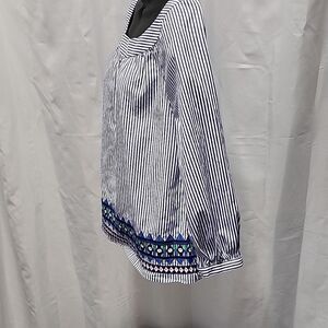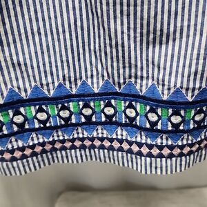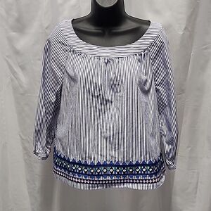 Playful and preppy! After a day in the sun, pop on this easy women's top with its easy, swingy fit. Fabrics: · 100% cotton Features: · Open neckline top with ¾-length sleeves and playful geometric embroidery along hemline · Preppy blue and white stripes