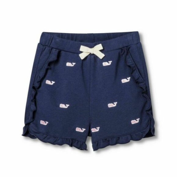 Adorable embroidered whale shorts with ruffle trim and bow in front.