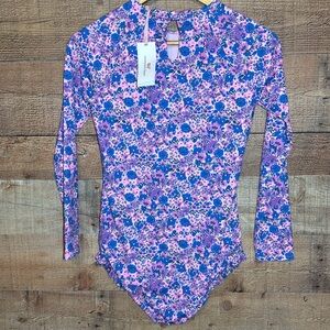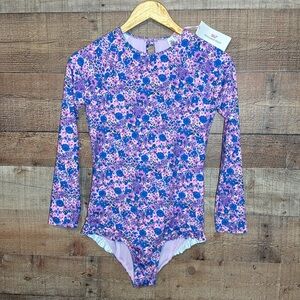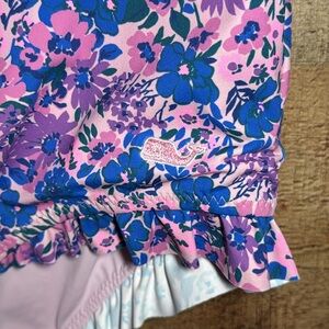 Vineyard Vines girls long sleeve ruffle one-piece swimsuit in Helen Floral size Large (16). New with tags. UPF 50+ great sun coverage! Cute tiny ruffle around leg opening. Single button back closure with keyhole and bow detail.