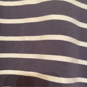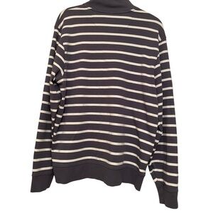Thick cotton material on this half-zip sweater, dark gray color with white stripes, long sleeves, mock turtle neck collar