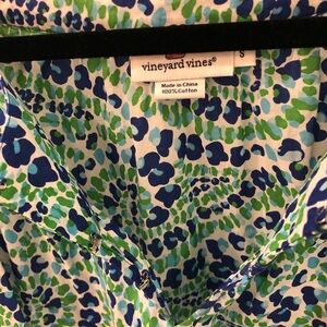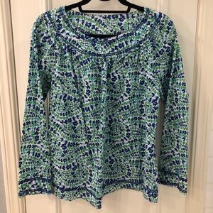 Excellent condition. Blue and green long sleeve tunic. 100% cotton. Embroidered pattern on sleeves and trims. Split neckline with hidden hook and eye closures.
