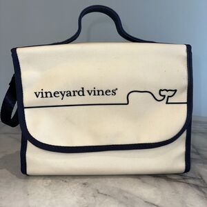 This was sold in target as an exclusive collaboration. This was designed as a baby bag. It got a removable changing pad inside of it. This bag was never used!!! However, there is some surface dirt from storage. Zoom in for condition and cleanliness because I do not try to clean the items I list for sale. Classic vineyard vines canvas wrapped in PVC on the exterior. Inside is polyester. One zippered pocket and one slip pocket handle at top and removable handle on side