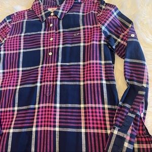 Vineyard Vines Harbor Plaid Relaxed Popover Shirt Blouse Navy Pink Linen