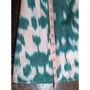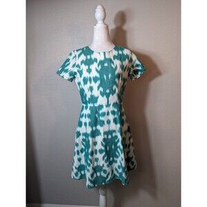 The Vineyard Vines IKAT dress, size 2, features a fit and flare silhouette, short sleeves, and a side zip closure. Made from lightweight cotton fabric, this dress is suitable for casual wear. It has a green and white ikat pattern, round neck, and button back accents. Suitable for spring, summer, and fall.