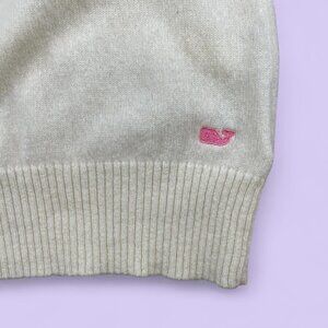 Classic Vineyard Vines ivory cashmere sweater in tagged size Medium. Made from 100% soft and luxe cashmere, this creamy neutral knit is perfect for layering or wearing solo. Features the signature embroidered pink whale logo at the hem. A few tiny holes noted on the sleeve (see photos), otherwise in great pre-owned condition.