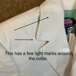 This is new with tags HOWEVER it has some very light spots on it - it’s almost like it hit the floor in a store and picked up dirt. I think it will come out with spot treatment but I left it as is since the tags are attached. These do not appear to be deep stains. I cannot guarantee anything though so once the tags are cut off I cannot accept a return for the full price paid. It’s a beautiful jacket though!