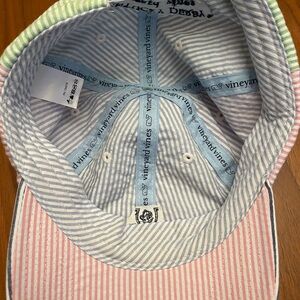Vineyard Vines hat with green and pink stripes searsucker. Features embroidered logo for Kentucky Derby. Hat in good condition no signs of wear