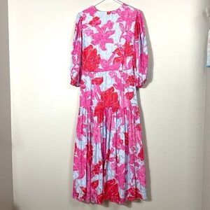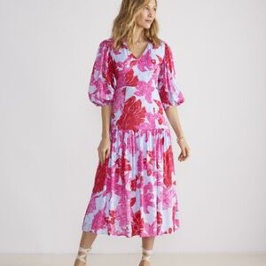 Chic midi dress with vibrant floral pattern. Features a flattering V-neck and elegant sleeves.