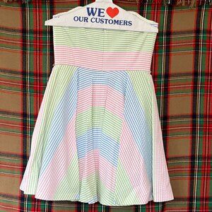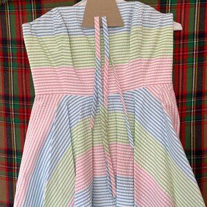 Featuring a strapless neckline, delicate tie at waist and seersucker material in a beautiful multi-color pattern.
