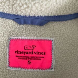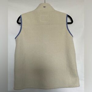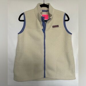 Cozy cream vest with blue accents. Sleeveless design. Full zip front. Perfect for layering.