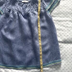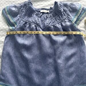 Stylish Vineyard Vines blue blouse with intricate neckline. Features aqua and yellow embroidered accents on flutter sleeves. Perfect for casual wear. 100% Linen. Excellent condition!