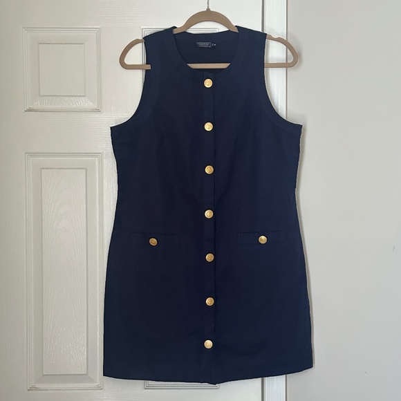 Excellent condition Vineyard Vines Linen dress, size Medium. Classic Nautical Navy color and sophisticated silhouette. Sleeveless dress. Linen material. Beautiful gold button detail. Elegant Coastal vibes
