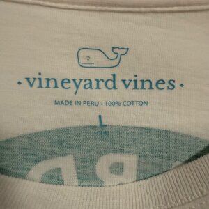 Vineyard Vines long sleeve white tee with teal green print in size Large. Features logo on front pocket, back, and sleeve. Good condition with measurements provided in pictures.