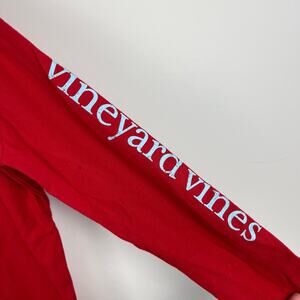Vineyard Vines Long-Sleeve Whale Graphic T-Shirt. Girls size medium (10-12 years). Bright red top with pink whale logo on front pocket and in back. Vineyard Vines down the sleeve in blue. Small spot on the cuff (see photo; untreated).