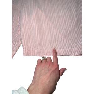 These shorts are preloved with signs of wear. Overall condition of fabric is good but there are a few discolorations spots. Please see photos. These are light in color and harder to see since there is texture to the fabric and the busy seersucker pattern. But they are there.