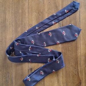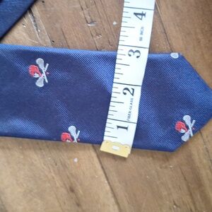 Elevate your style with this navy blue tie featuring a unique lacrosse pattern. Perfect for sports enthusiasts and adding a touch of personality to your formal attire.