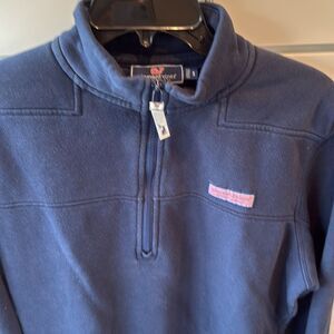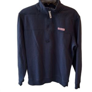 Classic quarter zip-up sweater/sweatshirt in dark blue. Ideal for layering. Comfortable and versatile. Can be worn out or to work. Gently used no flaws. minor wear.