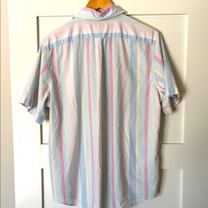 Casual button-down shirt with pastel stripes. Features short sleeves and a classic collar. Ideal for relaxed settings.