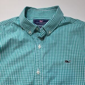 Vineyard Vines mens button front shirt with long sleeves. Green and white plaid.