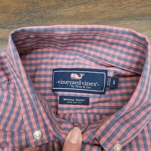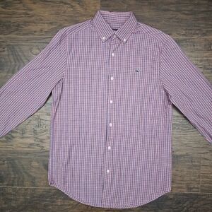 Add a touch of preppy elegance to your wardrobe with this Vineyard Vines men's button-up shirt in a small size. The shirt features a plaid pattern in blue and pink, with a button-down collar and long sleeves. It's made of lightweight cotton material that's perfect for spring and summer, and has a classic fit for comfort.