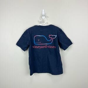 Vineyard Vines Navy Blue Ombre Whale Pocket Tee Shirt. Toddler boy size 4T. Casual short sleeve top with signature whale logo on the pocket and in the back in fun mix of blue, red, and white.