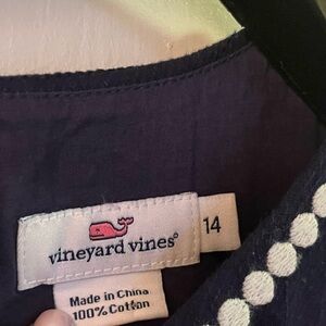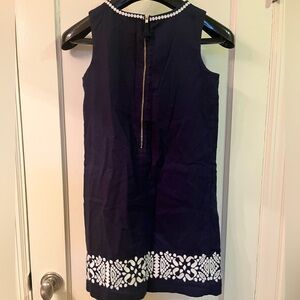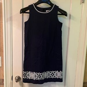 Beautiful navy dress with white dot accents. Perfect for any occasion. In excellent condition. Material is 100% cotton.