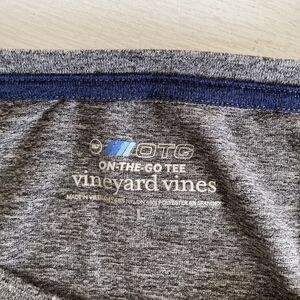 Vineyard Vines OTG On The Go T-Shirt Mens Large Gray Active Gym Casual Comfort. Vineyard Vines mens on the go performance athletic T-shirt. Crewneck. Short sleeves. Nylon, polyester and spandex fabric. Stretchy. Gray. Size large. Measured laying flat: 23" from pit to pit, 30" long from top to hem.