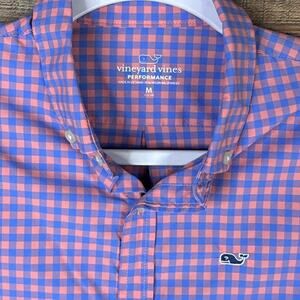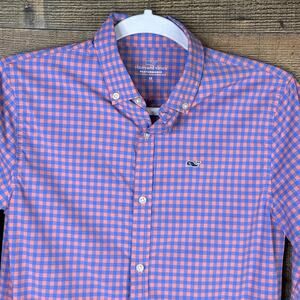 Vineyard Vines On The Go Gingham Button Down Shirt. Style# 3W001338. Size medium (Vineyard Vines website shows Medium is a 12/14). Embroidered logo on chest. Long sleeve. Moisture wicking. Performance fabrication. Excellent condition. Measurements are in the pictures.