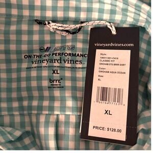On-the-Go Performance brrr Classic Buttondown by Vineyard Vines. NWT. Excellent Unused Condition. Designed for all-day comfort and performance, this shirt features stretch fabric for ease of movement, moisture-wicking properties to keep you dry, and brrr° cooling technology for a refreshing feel. The classic gingham pattern in aqua ocean adds a stylish touch, making it perfect for both casual and dressy occasions. A versatile wardrobe staple built for comfort and style.