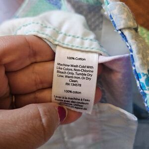 This is a pair of patchwork style shorts by Vineyard Vines. They are blue, pink, and green, and feature white whale tail print all over. On the back is a small embroidered whale. Note that there is a mark of discoloration on one cuff, as shown in the photos. There is a clasp closure at the fly with elastic and buttons inside of the waistband and pockets on each side.