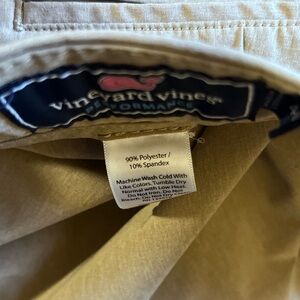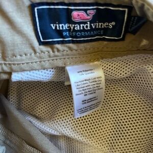 The Vineyard Vines Performance Breaker Shorts for men in size 40 are perfect for golfing with their stretchy and lightweight design in khaki color. These casual shorts feature a button closure, flat front, and slash pockets, making them both comfortable and stylish. Made of polyester and spandex, they are machine washable and quick to dry, ideal for outdoor activities in the warmer seasons. The shorts also have a preppy look with a touch of university-themed accents, making them a versatile and breathable option for a variety of occasions.