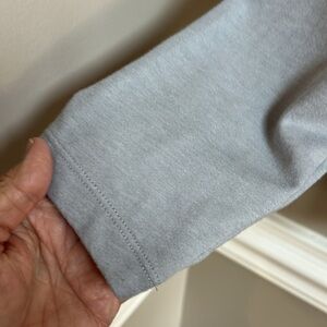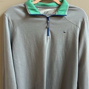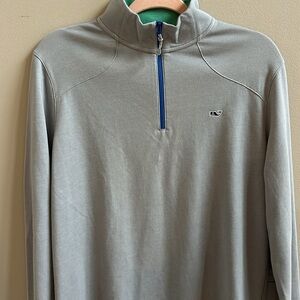 Vineyard Vines Performance Quarter Zip. Gray with blue zipper and green inside collar. 100% polyester. Whale logo on chest. Size Small