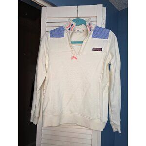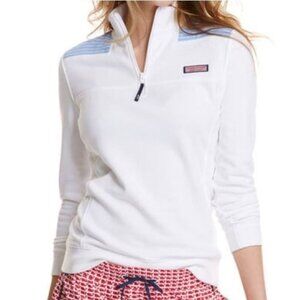 Elevate your activewear collection with the Vineyard Vines The Shep Shirt, boasting a stylish quarter-zip closure and a distinctive whale logo. In a crisp white with a hint of pink stripes, this sweatshirt is a versatile addition for both workout sessions and casual outings. Crafted for comfort, the long sleeves and pure cotton lining ensure a cozy feel throughout the day. Designed to cater to the active woman, this regular-fit sweatshirt is available in size XS, making it a snug and flattering choice. Whether you're hitting the gym or running errands, this Vineyard Vines sweatshirt combines functionality with fashion for a look that's both chic and comfortable.
