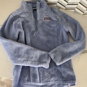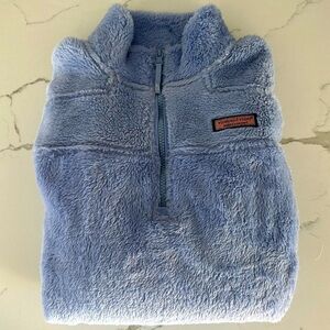 Vineyard Vines Plush Teddy Classic Shep Shirt in Blue/ purple/ periwinkle/Mystic blue. Features logo on left chest, long sleeves, pullover style, 3/4 zip, soft fleece, classic fit. Ribbed cuffs and hem.