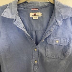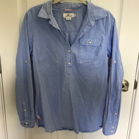This Vineyard Vines Women's Popover Top has only been worn a handful of times. Long sleeved. Color: Blue. Size: 4. 100% Cotton. Has Vineyard Vines whale logo on the bottom corner of the shirt. Like new condition. Very soft and comfy. Has pocket. Has adjustable sleeve length. DOES NOT button down all the way.