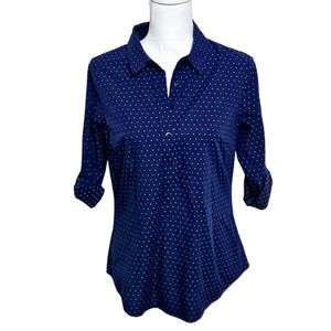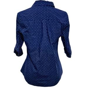 Vineyard Vines Popover Top Sz 6 Blue White Polka Dot Roll Tab Sleeve. Shirt is in good, gently used condition. No rips, tears or stains. Please reference photos for details and measurements. It has plenty of use left!